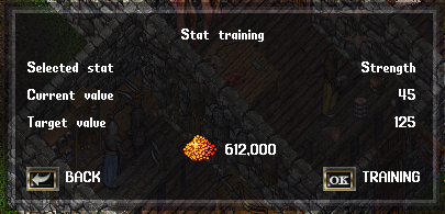 Stat training can be bought at NPCs. Both increase (to a maximum of 125 individual and 250 of stat cap with scrolls) or lower (to a minimum 10) of the stat value is possible.